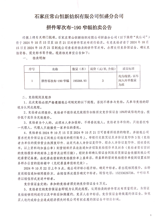 石家莊常山恒新紡織有限公司恒盛分公司 拼件零次布-190 窄幅拍賣公告