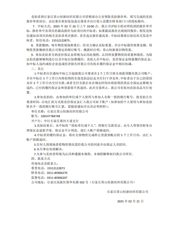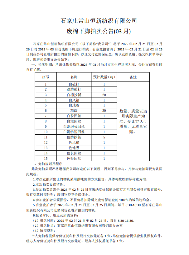 石家莊常山恒新紡織有限公司 廢棉下腳拍賣(mài)公告(03月)