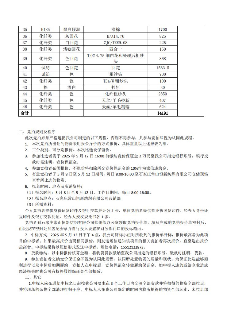 石家莊常山恒新紡織有限公司 處置車間長期閑置原料、半制品及下腳的比選公告